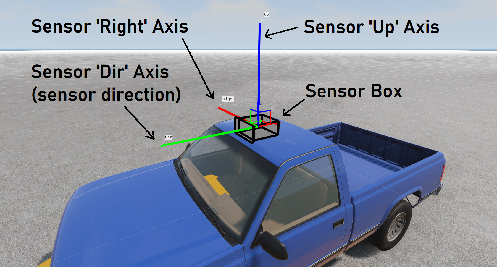 This is why the actual triangle to which the sensor is attached is important - it is the orientation of that triangle which will be inherited by the sensor. The user cannot set this, however. We point this out for informative reasons, for when/if the user creates a sensor which is quite far away from the vehicle mesh.