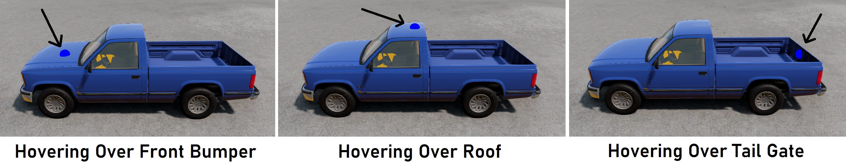 The user can select one of the positional sensors, then hovering the mouse over the vehicle should reveal a coloured sphere. Note that if the user moves the mouse away from the vehicle, this sphere will disappear. The image below shows the sphere when hovering over different parts of a vehicle.